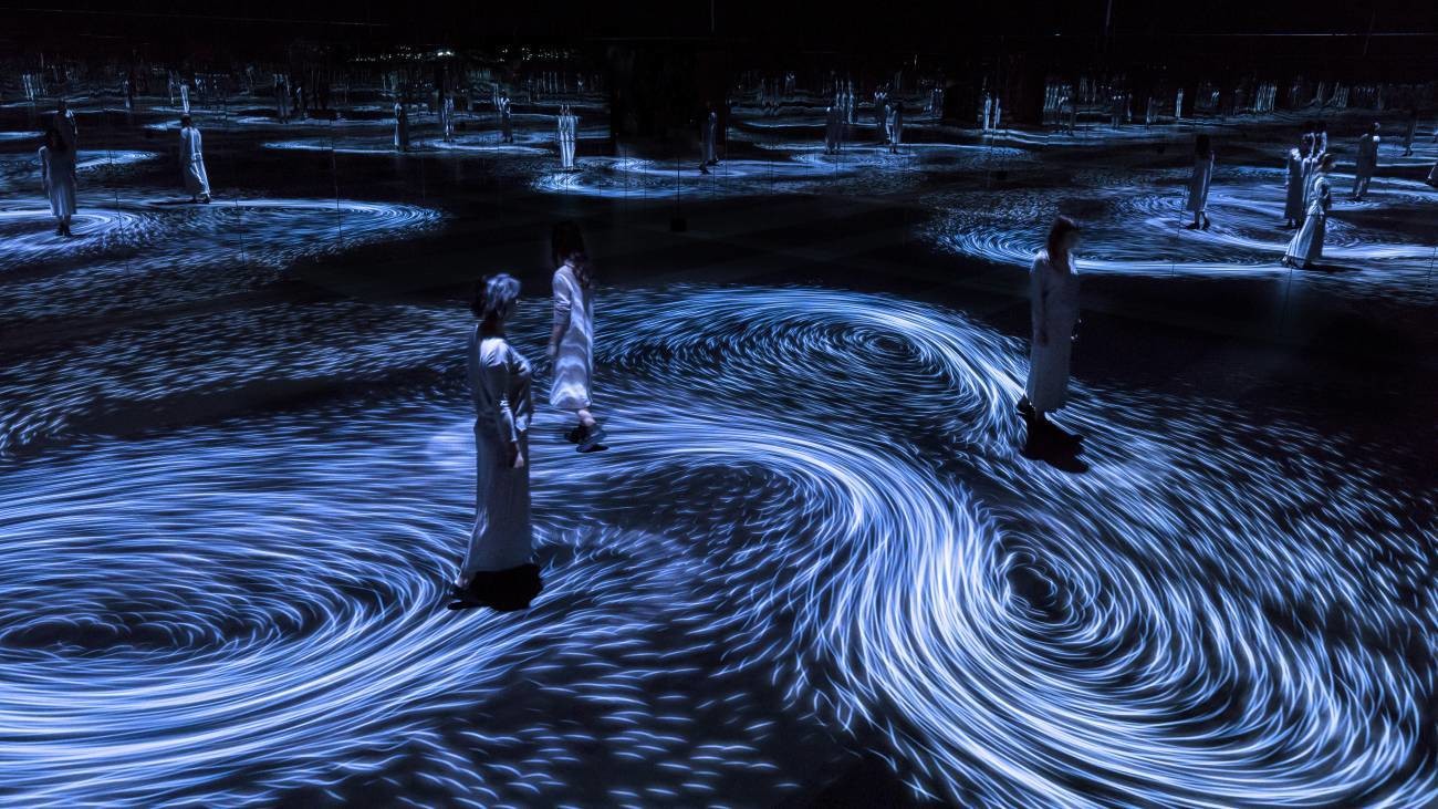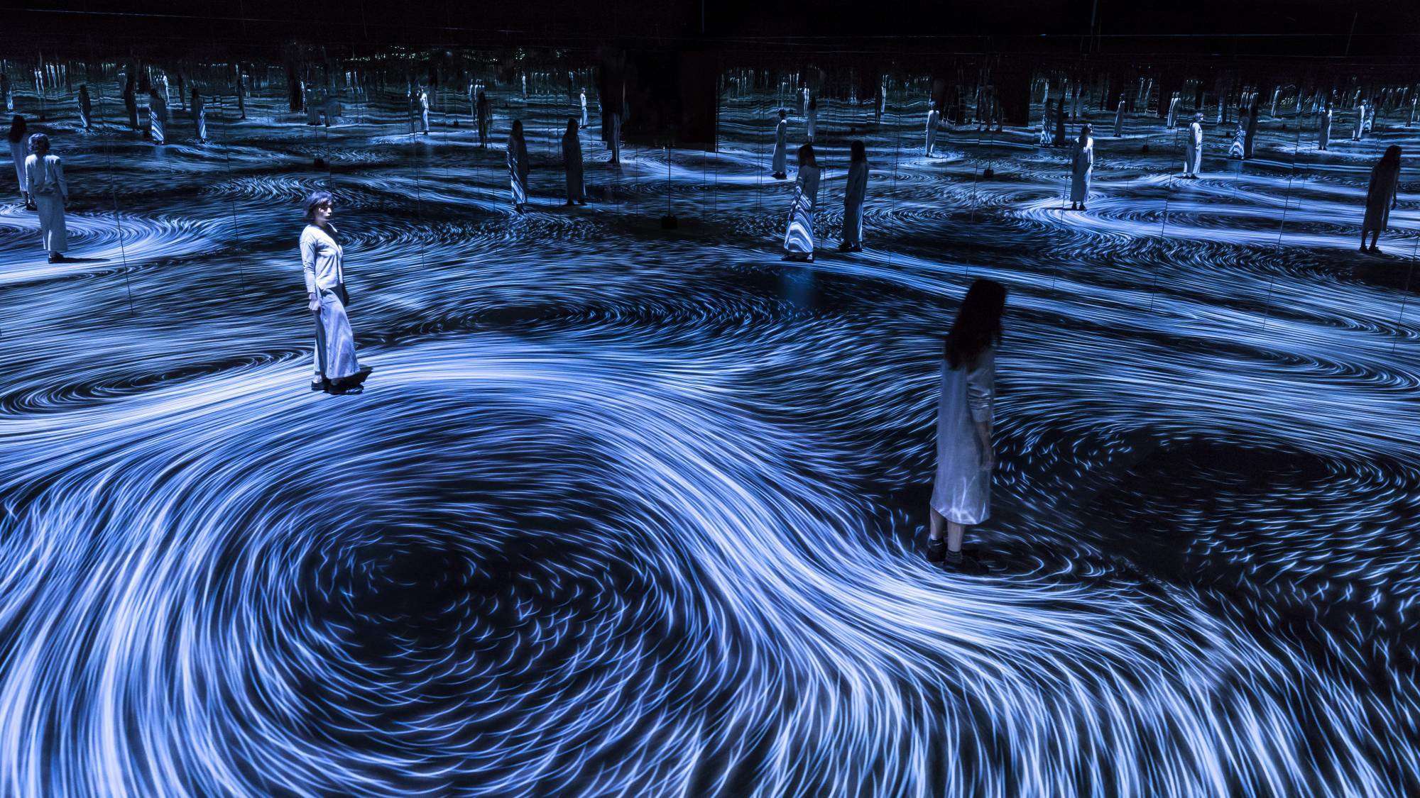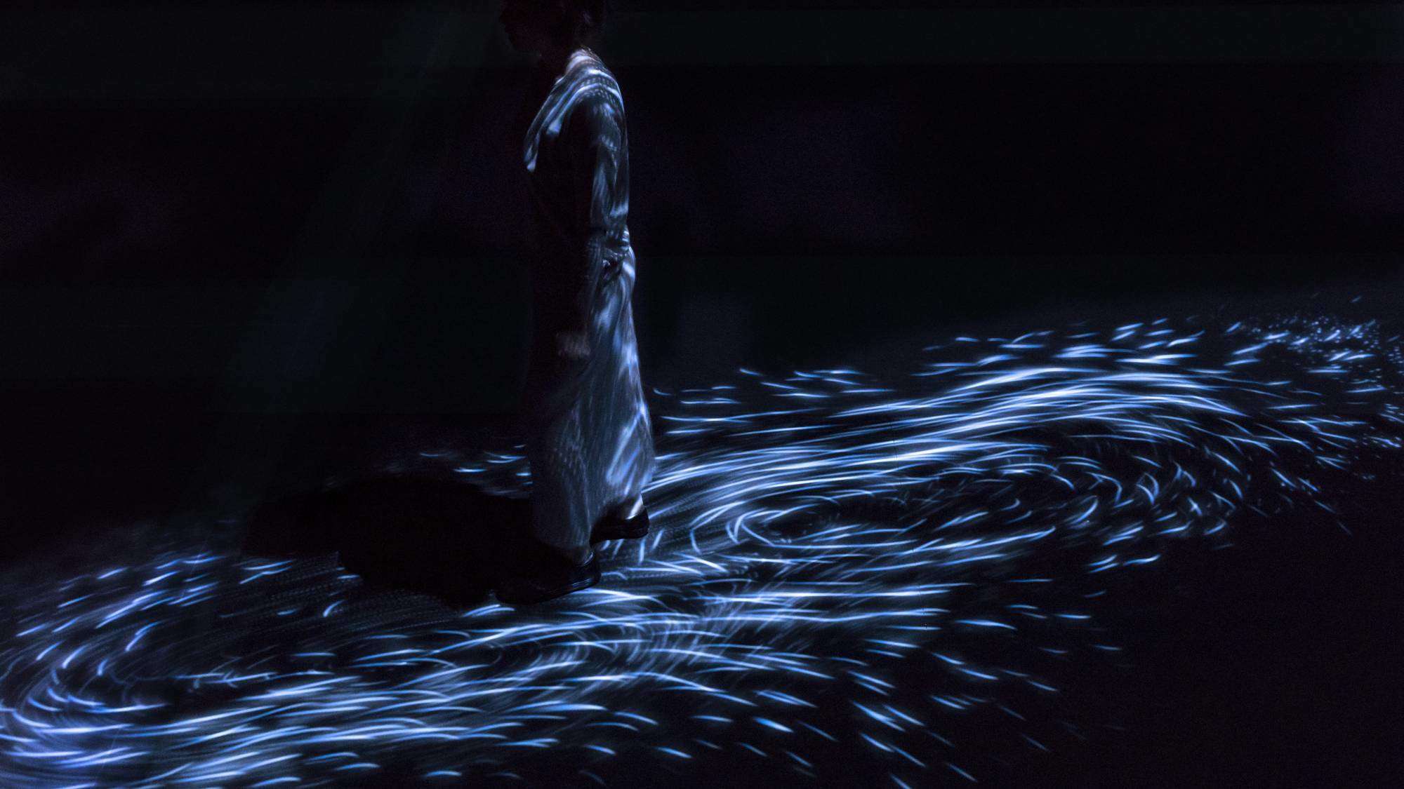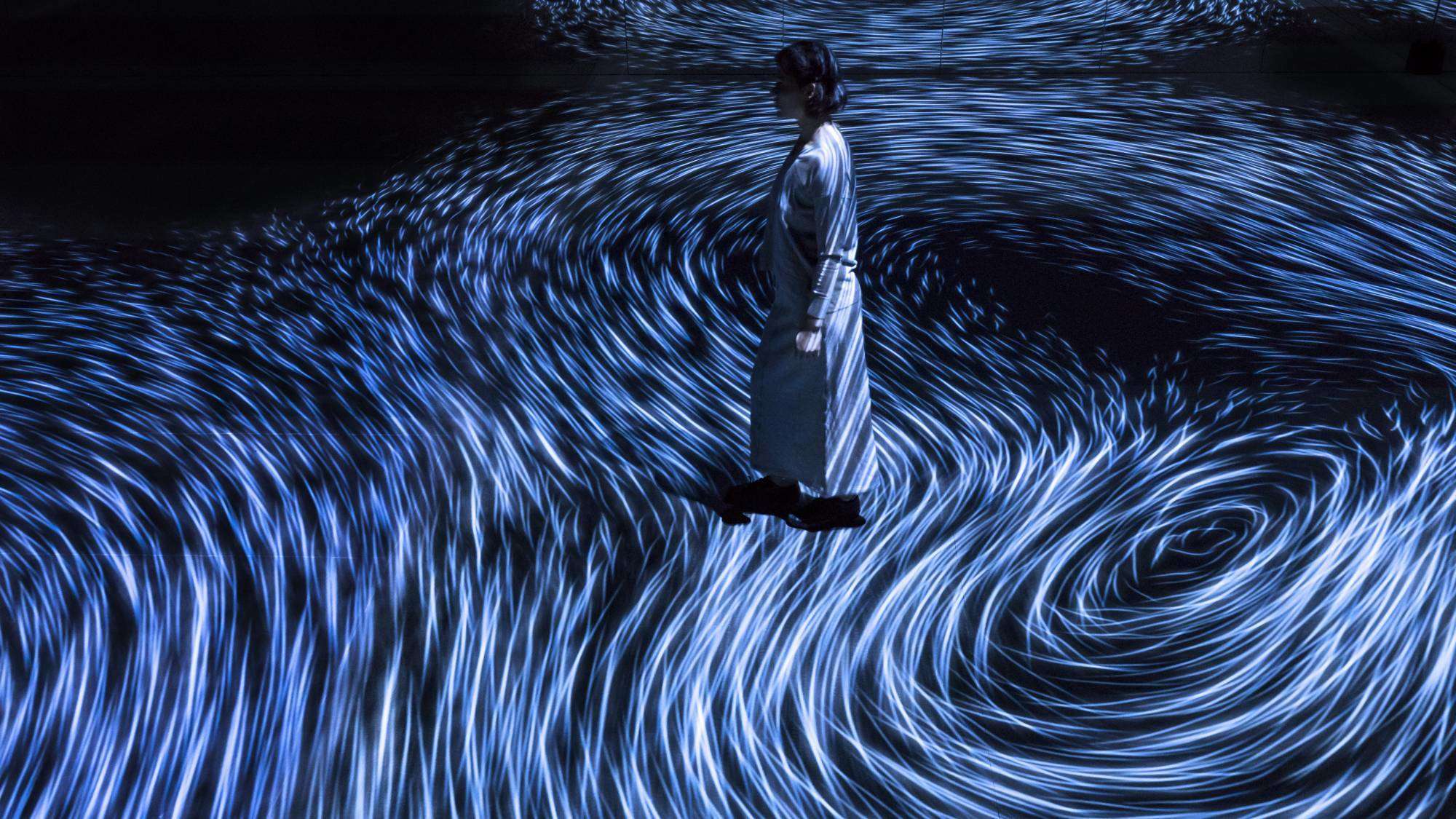 日本的TeamLab带来了新奇的艺术性互动装置,旨在重现漩涡的迷人运动形态。“行动创造漩涡”和“漩涡创造行动”这个项目表现了将智慧生物体与行动之间通过肌体反应达成的纽带。旋涡的流转方向取决于参观者的动作和速度。在没有动静的情况下,房间会重回黑暗。