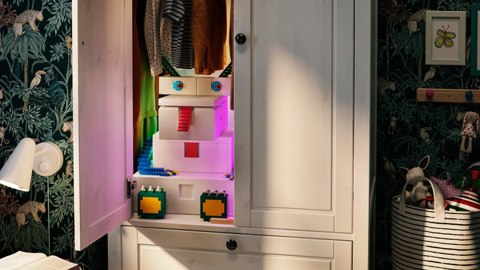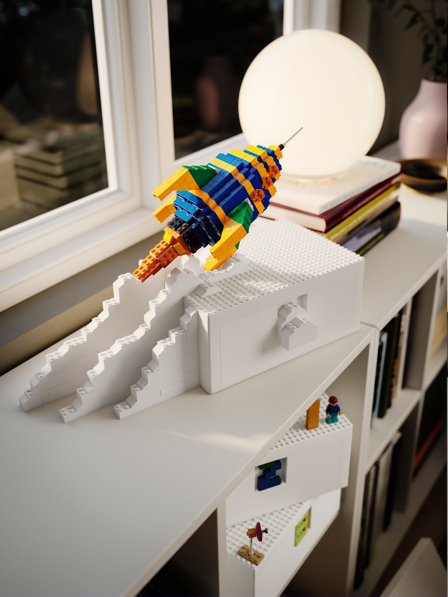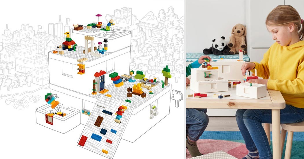 两大北欧知名品牌宜家和乐高合作开发了“Bygglek收纳盒”——由乐高积木组成的盒子,旨在将整理变成一种游戏。Bygglek收纳系列包括一套三个小盒子,两套大盒子,每个盒子的盖子和正面都有乐高钉子,还有一套乐高积木。这个合作系列的目的是“鼓励玩耍,为整理家居注入更多乐趣”,给孩子们提供一个既是搭建平台,又是存放乐高作品或作为展示平台的乐高盒子。