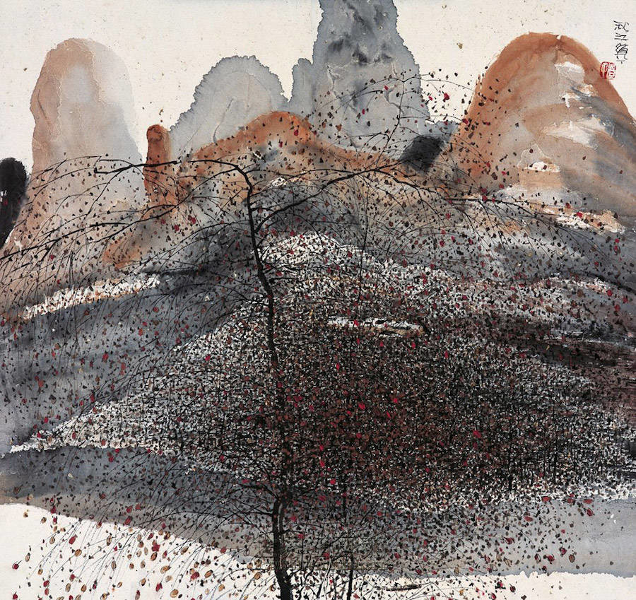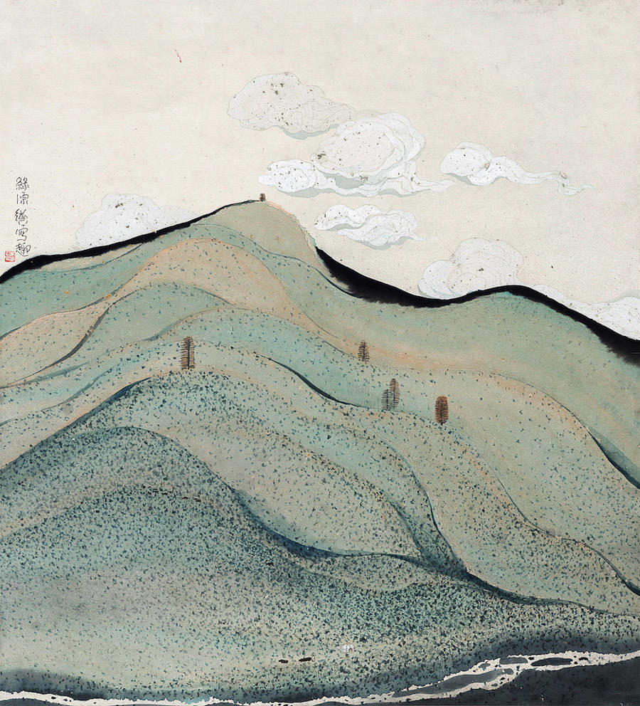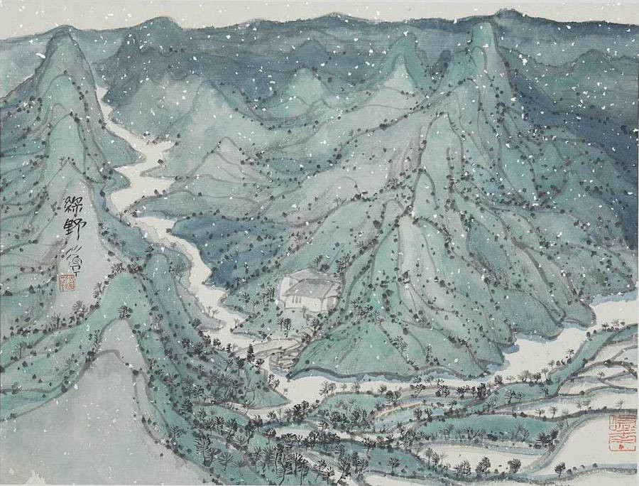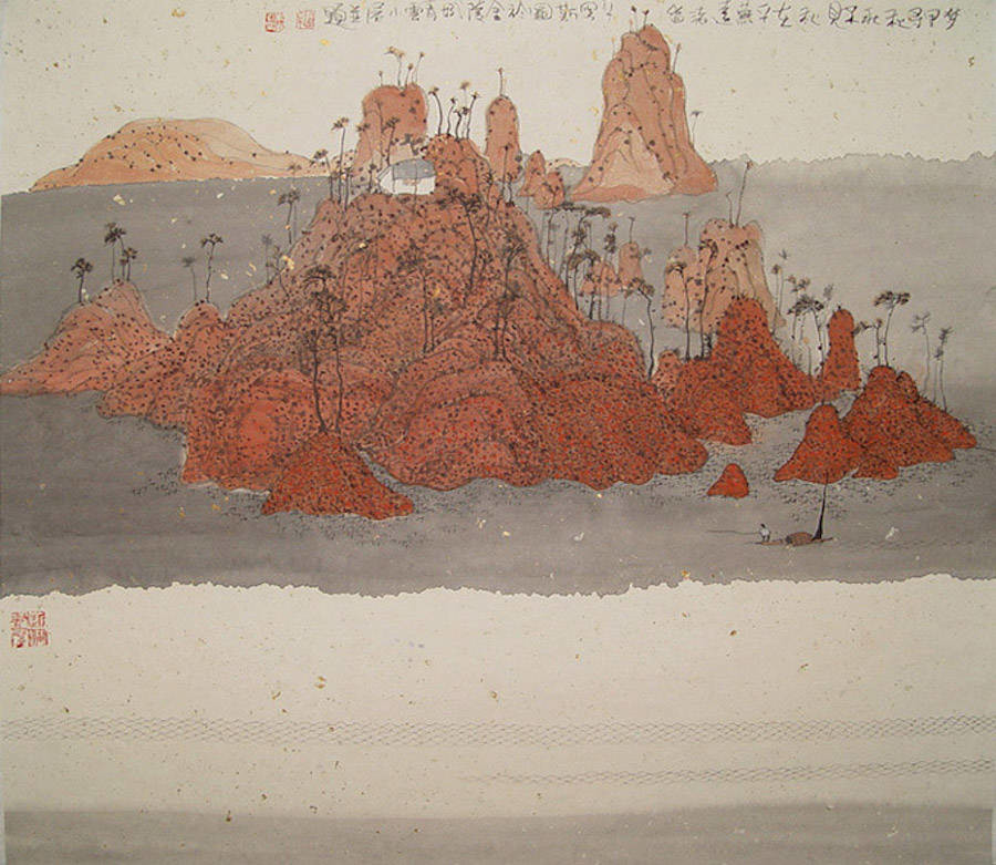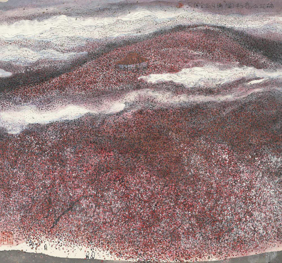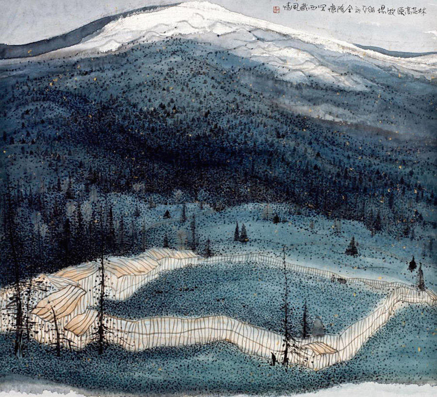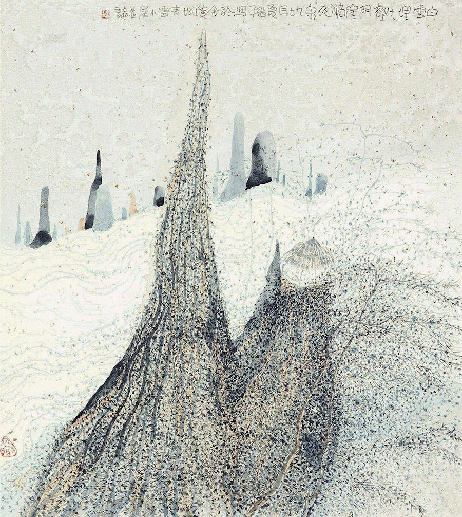 中国艺术家Zhu Daoping擅长绘制山水,他所创造的山区景观似乎被剥除了人的存在。画家使用印象派常用的点彩画技巧与简单的线条,重塑了中国的传统山水画面。