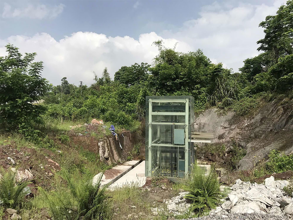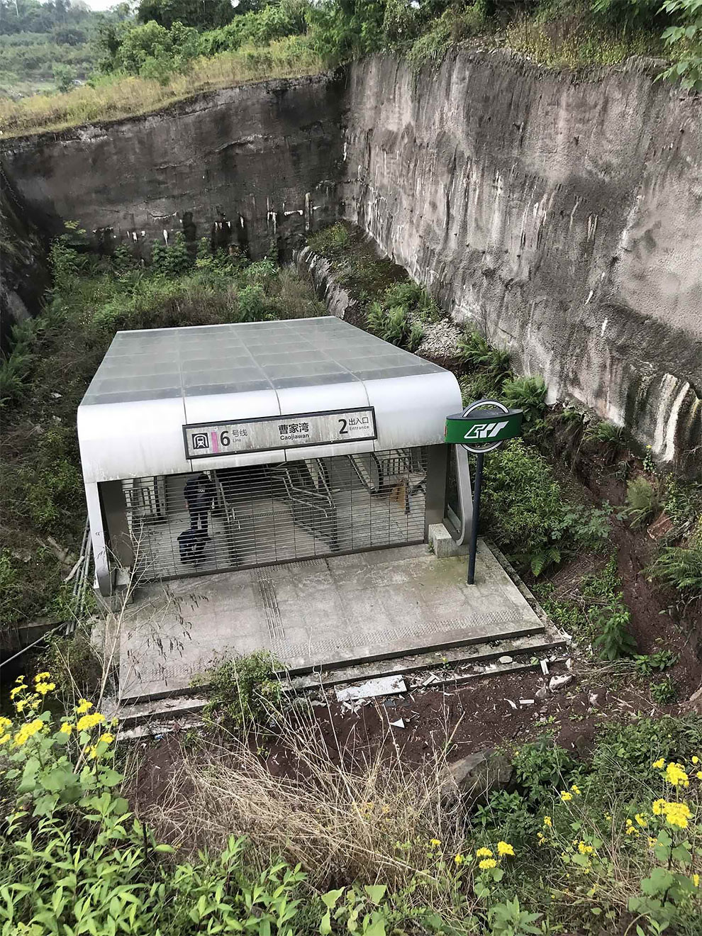 中国重庆的这个地铁站似乎被遗弃在荒野之中,但毫无疑问,它正运转在既定规划的准确位置上。这是个全新的车站,为了发展交通网络,重庆在城区间的结合地带设立了这个位置奇特的车站。车站的乘客稀少,内部十分现代化,与周围的自然形成鲜明对照,形成超现实的画面。