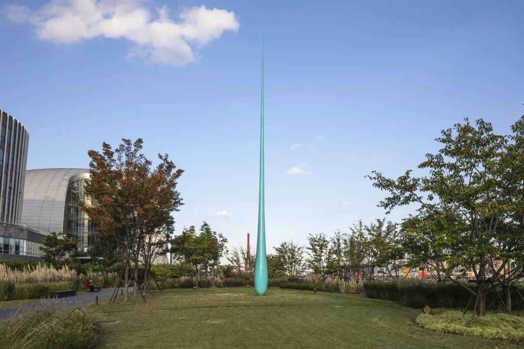 从天而降的雨滴造型抽象、安静、纯粹,从自然的形态中抽离出来,同时与艺术家的重要作品《迹象》及个人艺术语言柤关。单纯抽象的雨滴形态,会让人感受到自然与生活及艺术的密切关联。作品的颜色采用荧光材料,晚上长长的激光射线让人感受到雨滴造型似从天而降。
