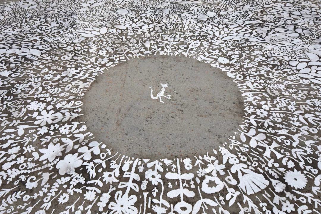 人、自然、物、历史、过去现在未来、各种各样的东西在这里相遇,存在着无比的生命力。作品将此生命力可视化,将刺青般的画刻在场所中。作品使用斑马线白线材料,制作象征植物的花朵,象征移动生物的鸟类,透过它们来探讨在城市中自然的存在方式。艺术家在此驻地一个月,与助手以及经过并加入的市民一同工作,为这片场地注入更多的可能性与生命力。