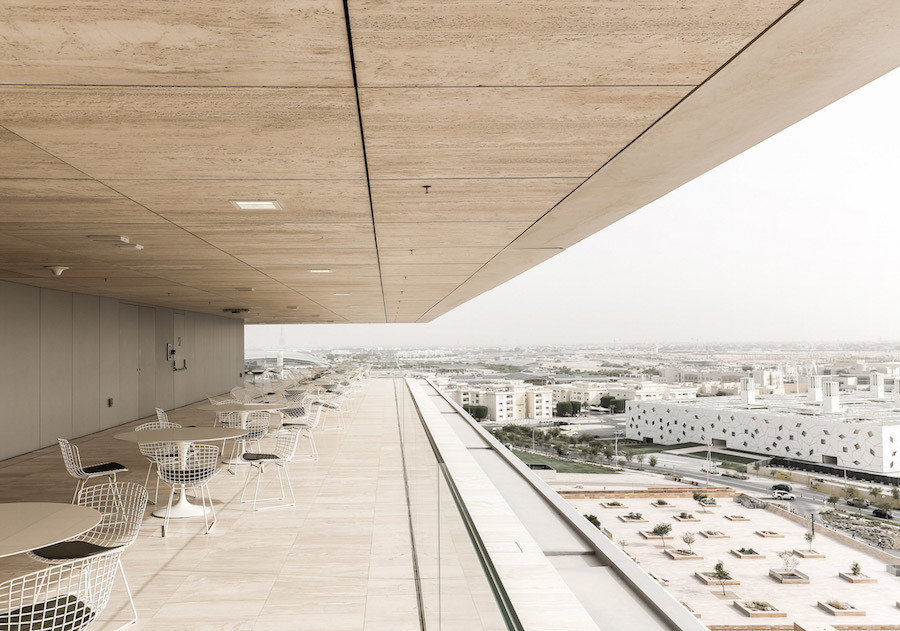 卡塔尔基金会是一家促进该国收入增长的非营利组织,OMA建筑工作室为其设计了两座巨大的建筑。第一栋专用于行政办公,另一个则是学习中心。两栋建筑都配备了许多凸窗,以优化进光量。在七层楼顶,开放的露台让人得以观赏多哈的都市景观。