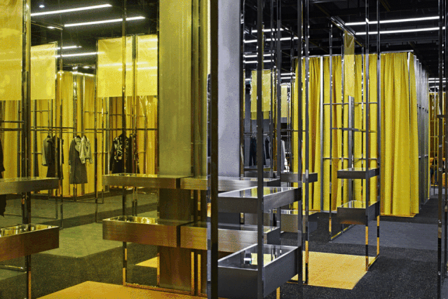 连绵的曲折的内部空间隐喻了羊绒的柔软材质。为了强调羊绒的轻柔感,Waa想到了通过展示架来营造一种漂浮感,同时展示架的金属镜面效果可以衬托出羊绒特有的柔和光泽。展示架的一些角度被刻意消失,而另一些角度被刻意夸张,以强调空间的变形和连绵,从而与服饰本身形成呼应。
